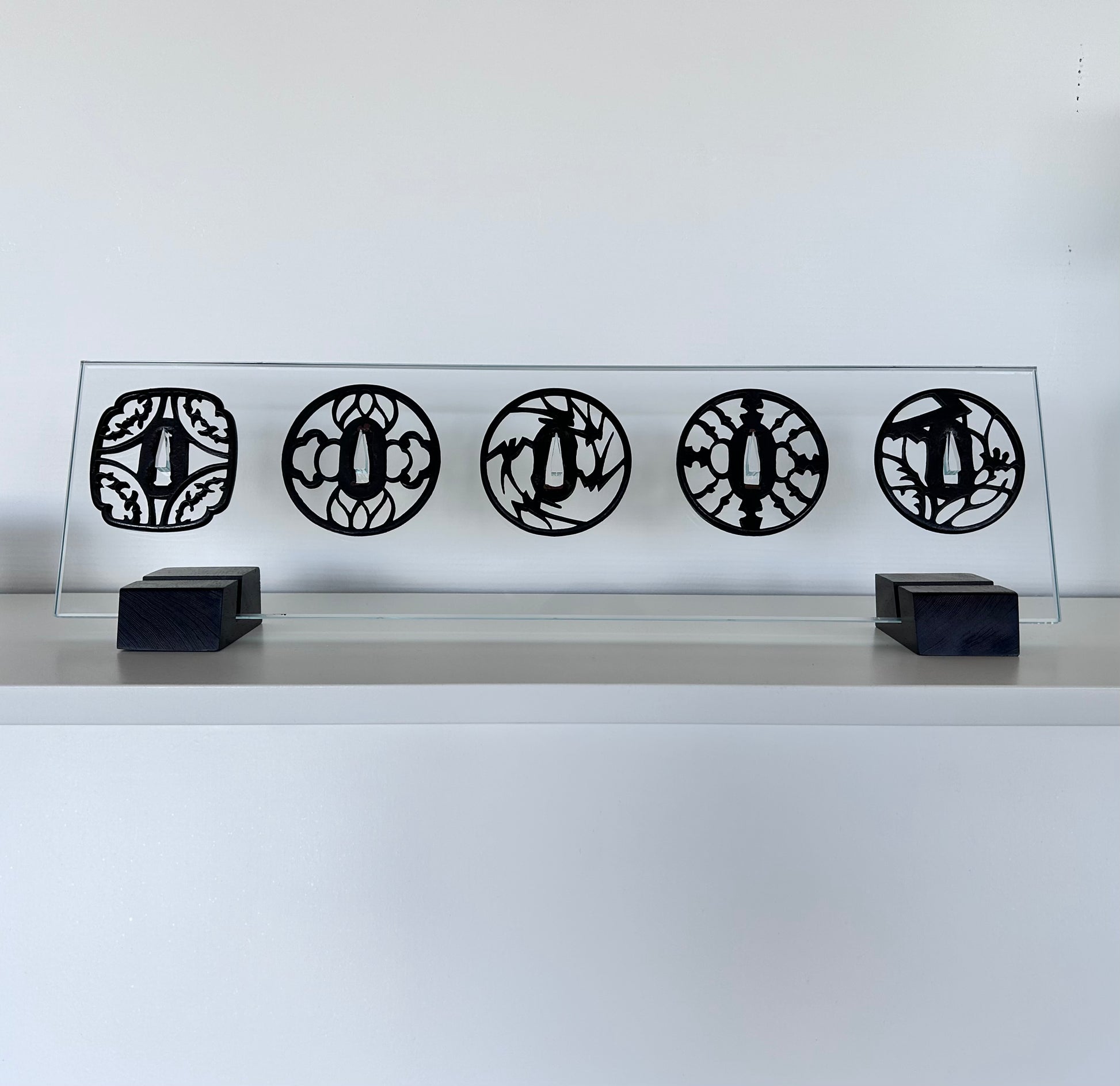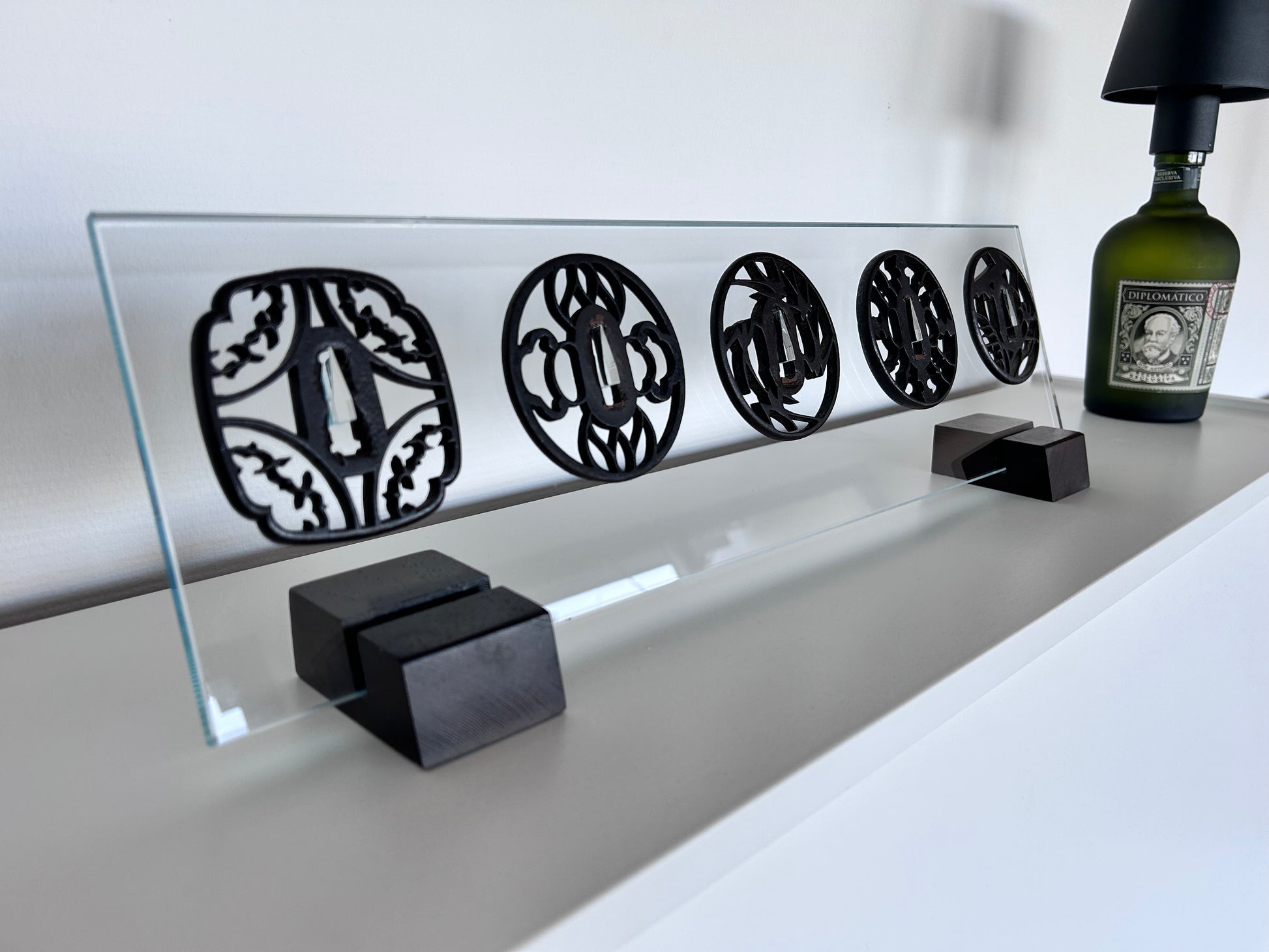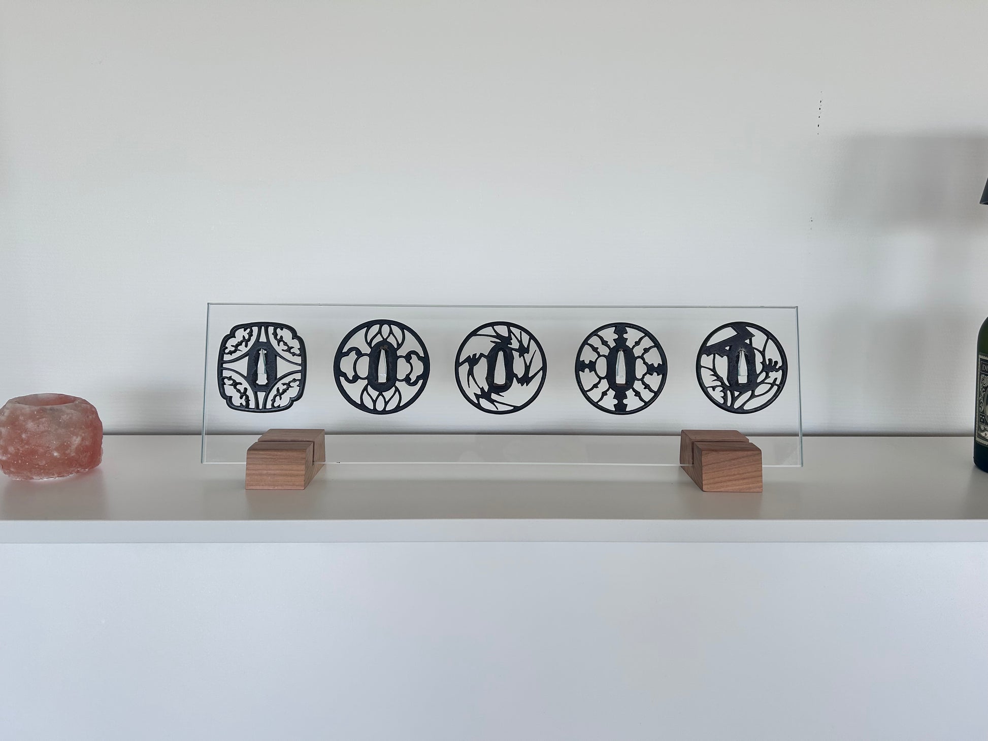 These Stands fit 5 Tsuba. Available only in a clear with massive 8 mm thick glass backplate. The wooden base is movable. There are two versions available. One cherry and one in wenge wood. 100% handmade in France.