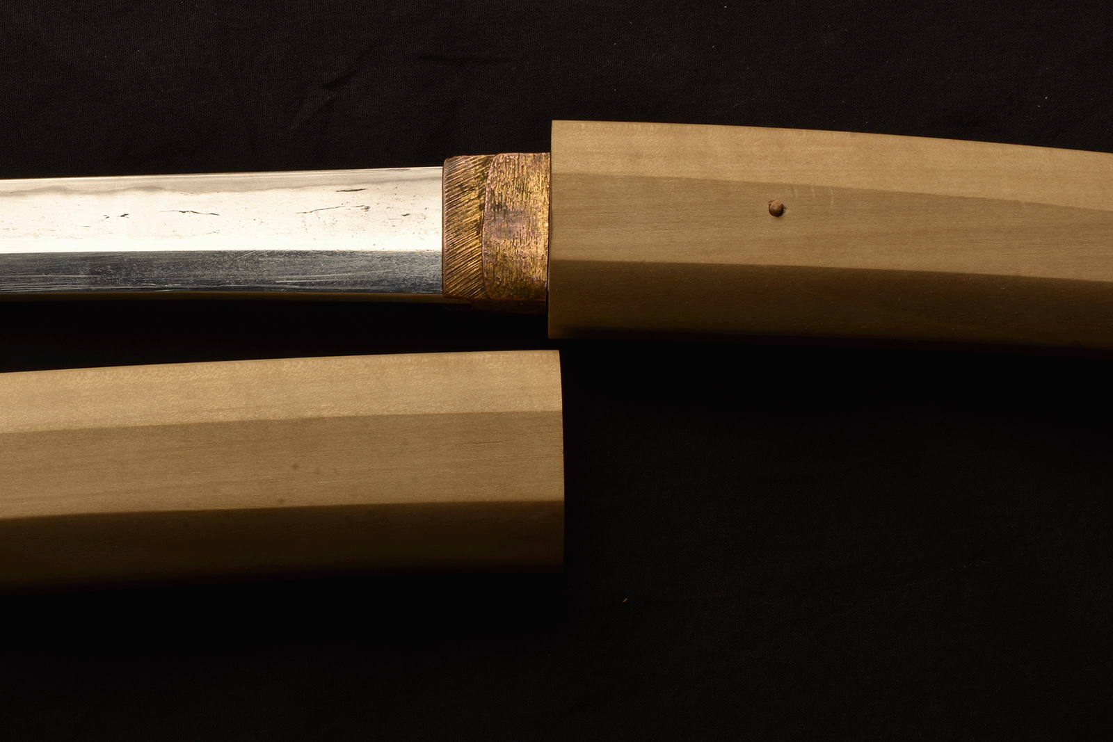 Hamon: irregular Yasurime: Kiri, slight katta-sagari Nakago: Iriyama-gata (typical for Yamato-province or Shinto) Typical Kaga-School Nakago end. Kantei opinion: Kiyomitsu (初二清光) from Fukishima School as Smith would be a good call. Habaki: two parts, Copper, gold/brass plated |