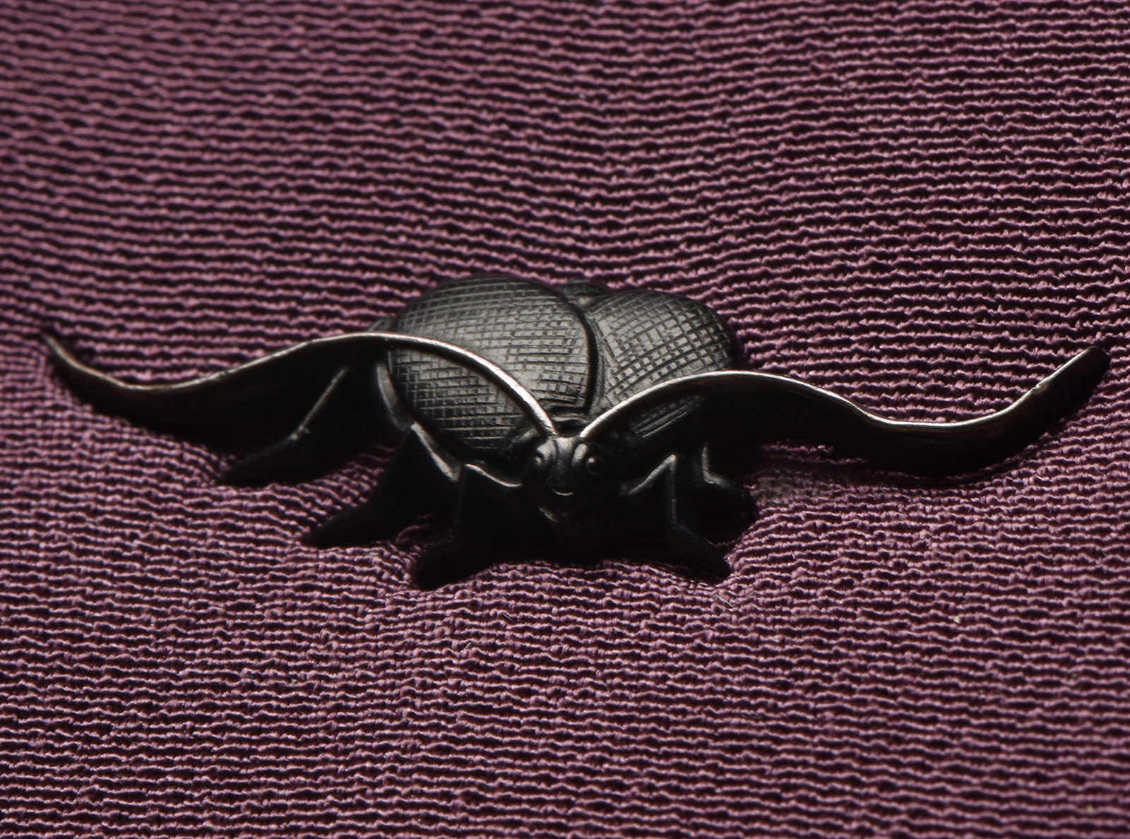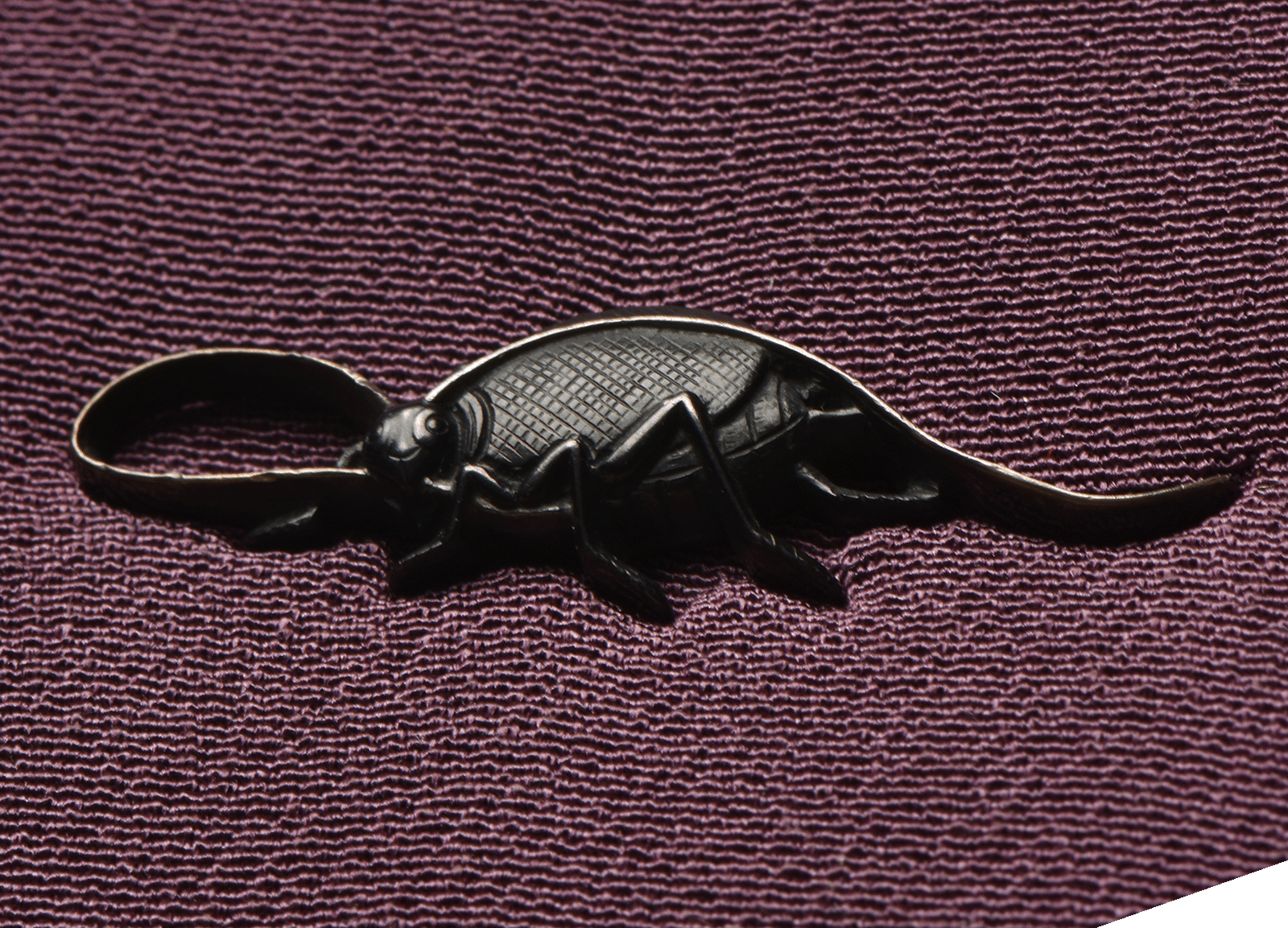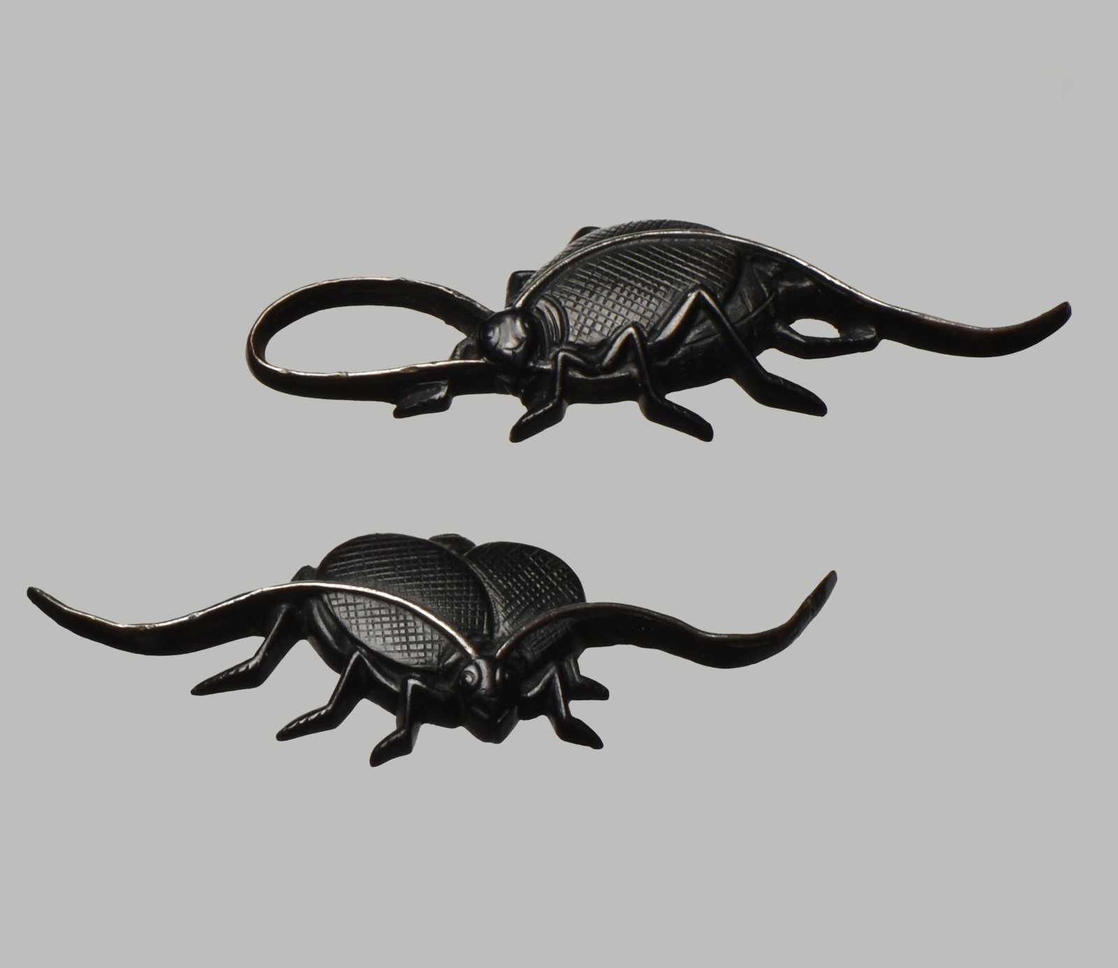 The pair of antique menuki by Kono Akiyoshi (河野 明義), certified NBTHK Tokubetsu Hozon, depicts two finely modeled insects—likely crickets or ground beetles—rendered with exceptional precision and naturalism. Each insect displays a delicately textured carapace, elegantly curved antennae, and sharply defined legs, all executed in the refined kinko style characteristic of the Kono School, known for its meticulous attention to natural subjects and superb metal-surface treatment.