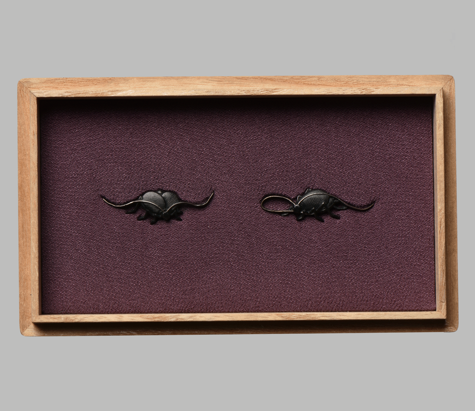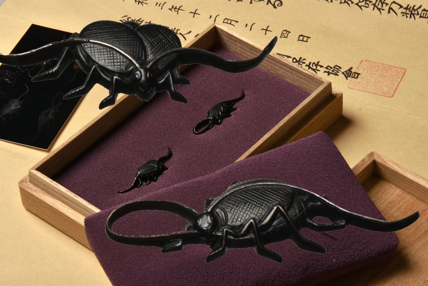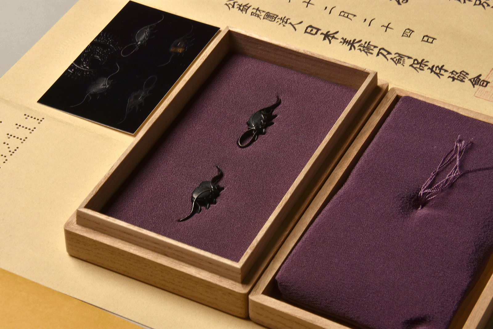 The pair of antique menuki by Kono Akiyoshi (河野 明義), certified NBTHK Tokubetsu Hozon, depicts two finely modeled insects—likely crickets or ground beetles—rendered with exceptional precision and naturalism. Each insect displays a delicately textured carapace, elegantly curved antennae, and sharply defined legs, all executed in the refined kinko style characteristic of the Kono School, known for its meticulous attention to natural subjects and superb metal-surface treatment.