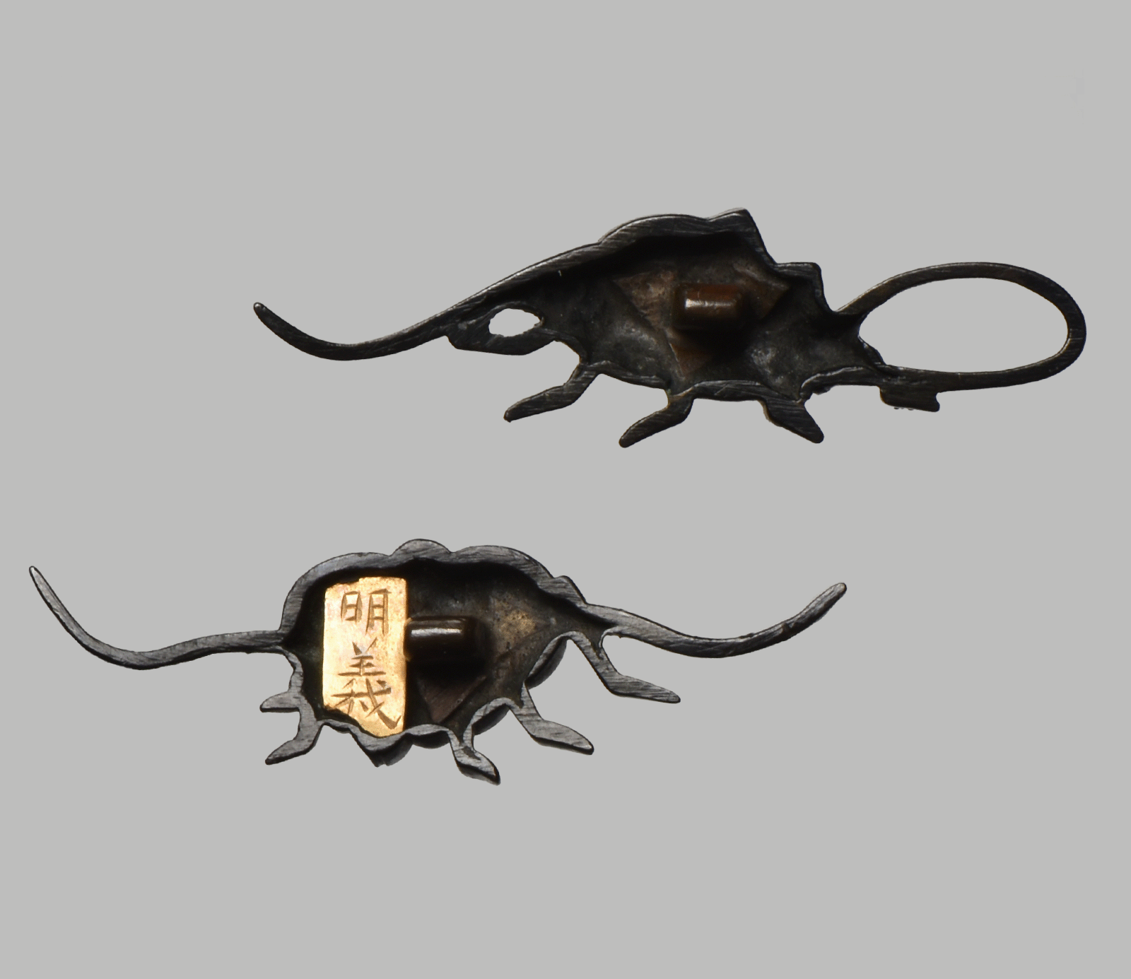 The motif of insects, especially crickets (koorogi), carries deep cultural symbolism in Japanese aesthetics: they evoke the quiet beauty of autumn, the sensitivity of classical poetry, and the concept of perseverance expressed in their persistent chirping. For a samurai, choosing such menuki could signify an appreciation of subtle, introspective symbolism rather than overtly martial imagery; the theme reflects inner discipline, emotional refinement, and a cultivated awareness of nature’s transient beauty—qualities highly valued in Edo-period warrior culture. The craftsmanship, style, and documented lineage suggest a late Edo period origin, fully aligned with the artistic traditions of the Kono School and the known work of Akiyoshi (明義).