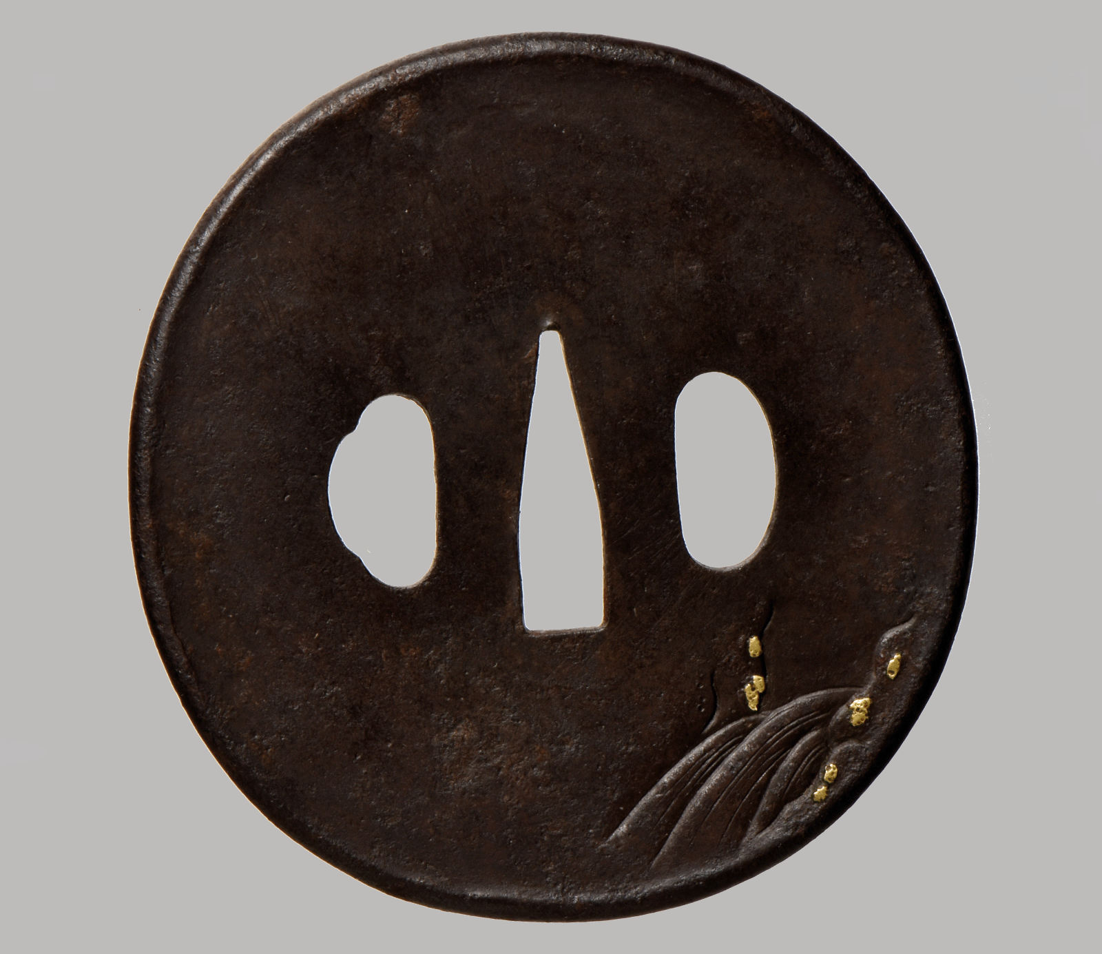 Decoration is executed in low to medium relief carving (takabori) with restrained yet effective use of gold and silver nunome-zōgan to highlight blossoms, leaves, and ground details. The inlay is applied sparingly, in keeping with the Aizu Shōami aesthetic, which favors narrative charm and tasteful contrast over excessive ornamentation.