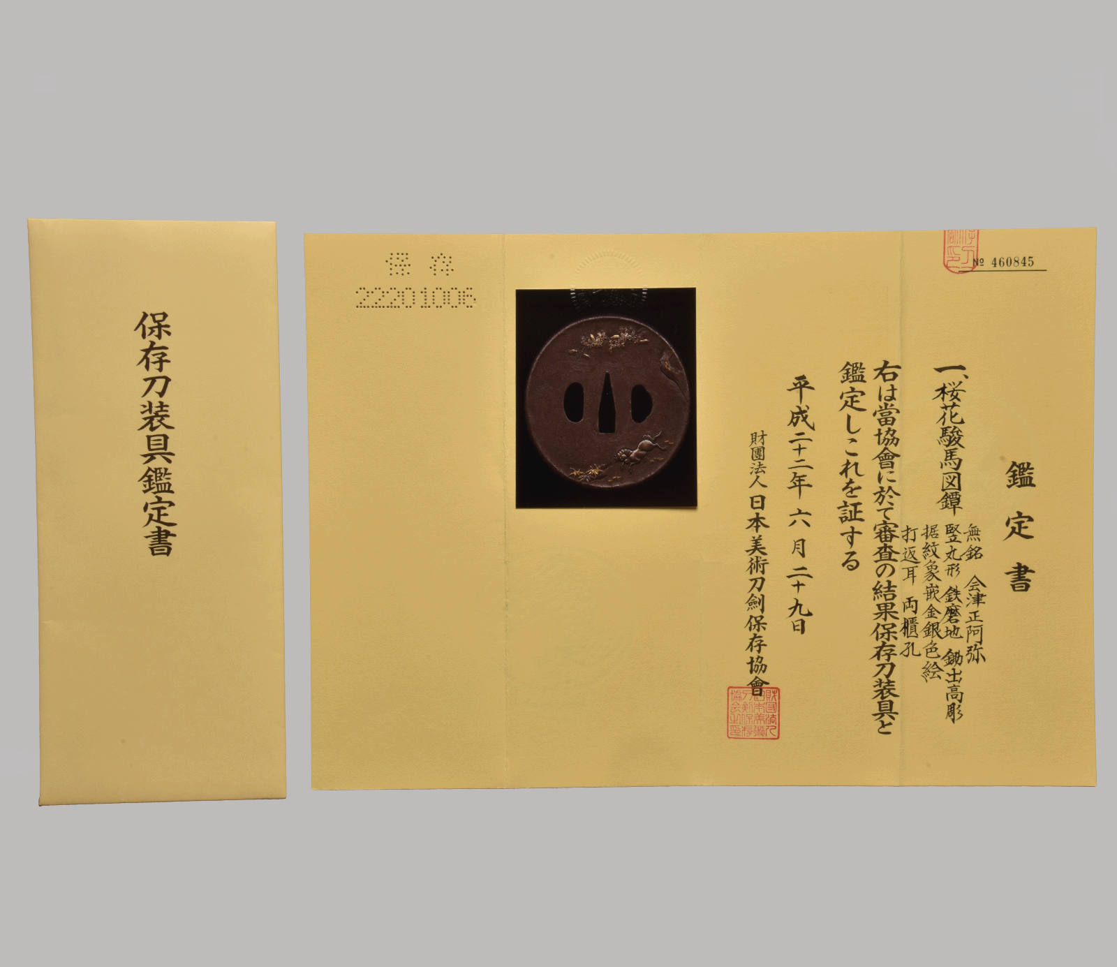 The NBTHK attribution confirms the workmanship as a genuine product of the Aizu Shōami lineage, a regional branch of the broader Shōami tradition known for its pictorial themes and reliable, high-quality iron guards.