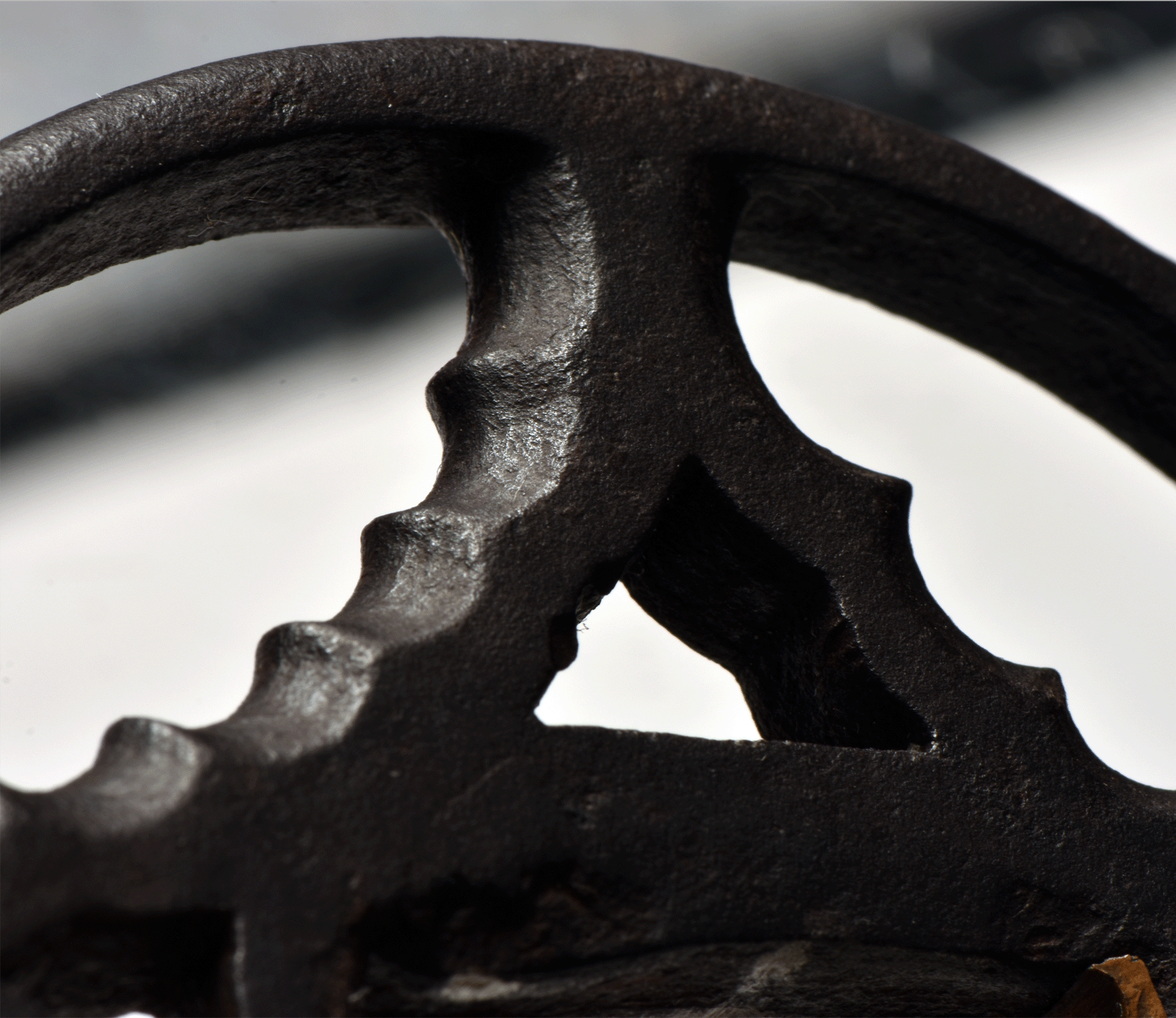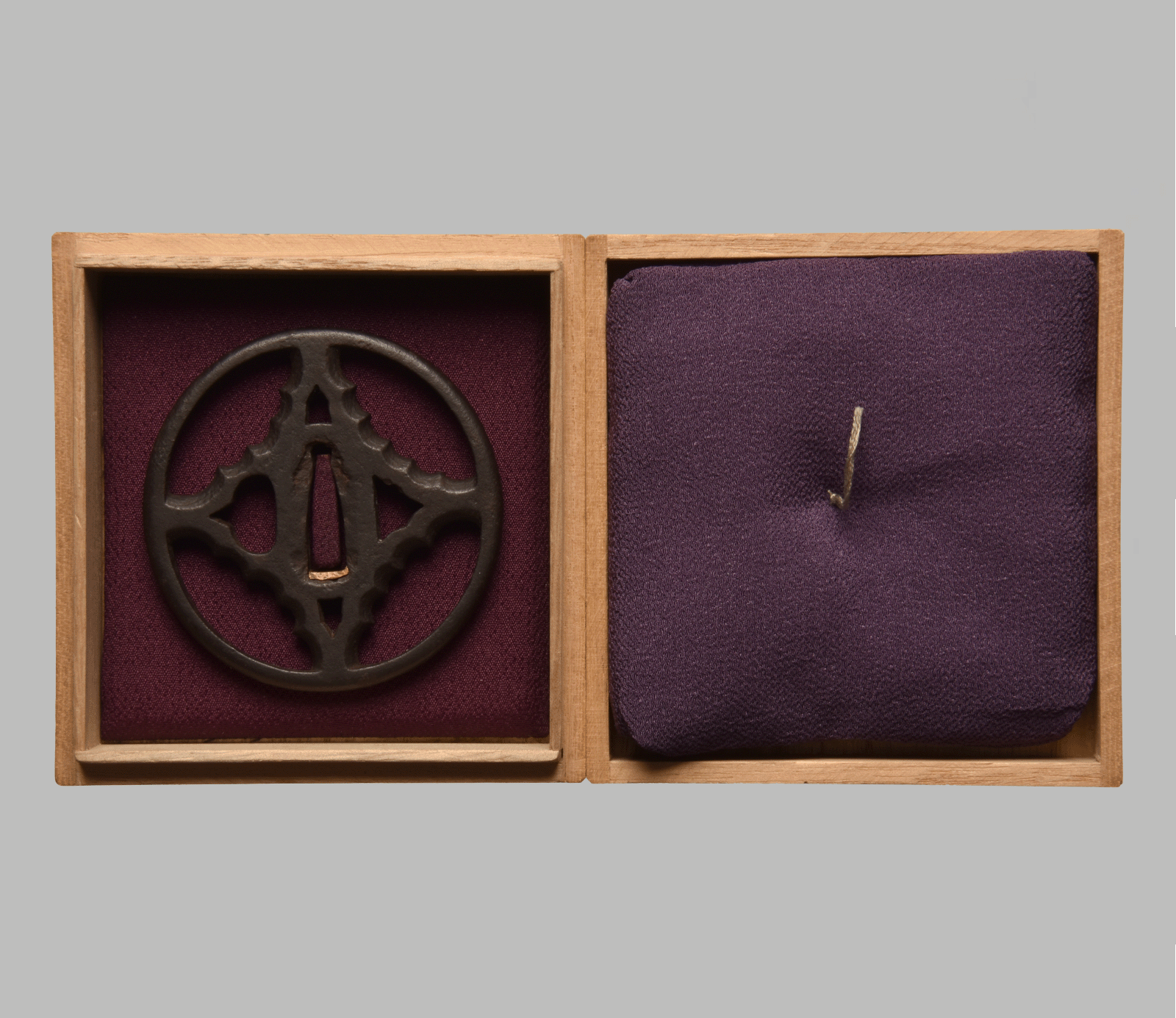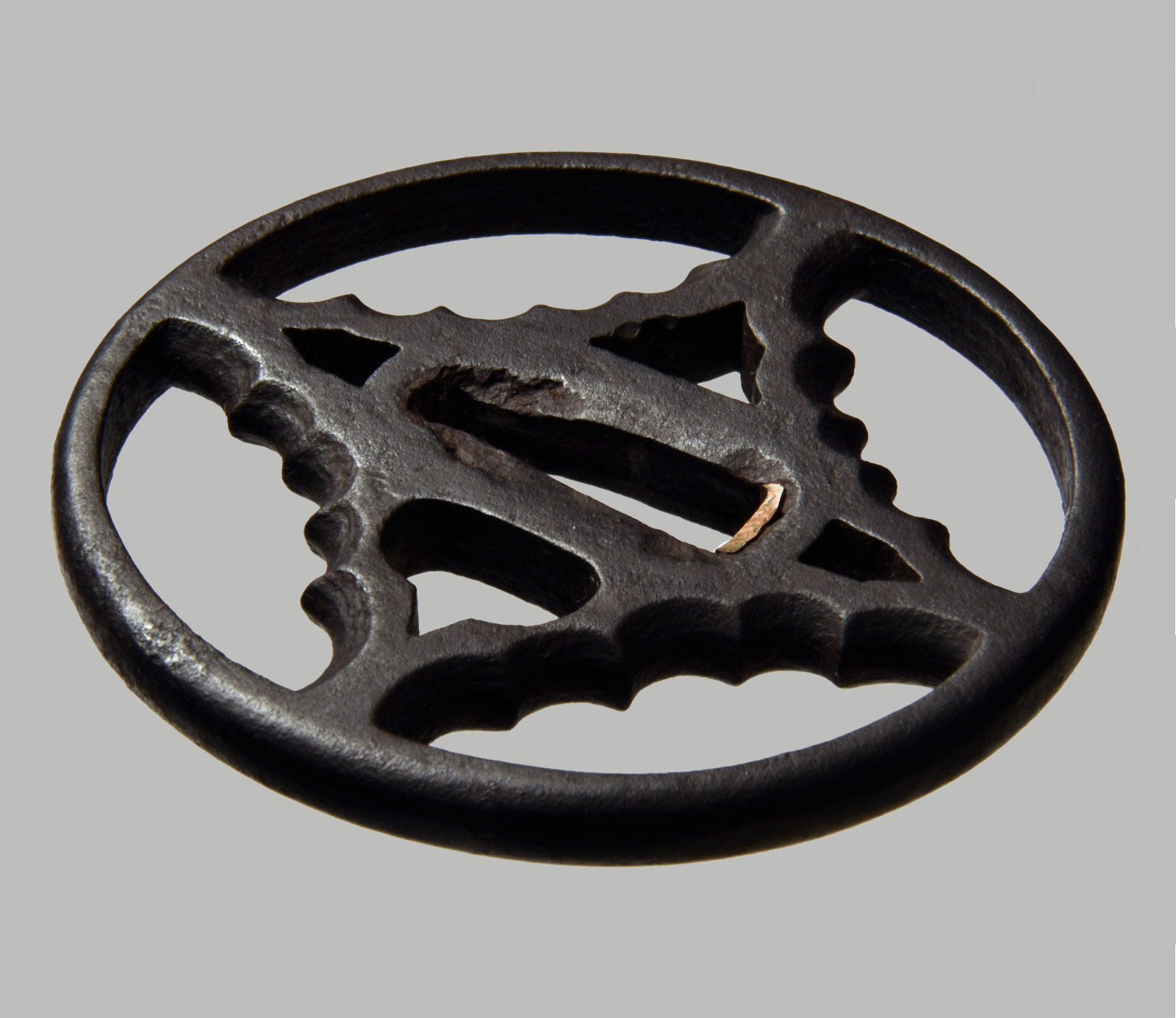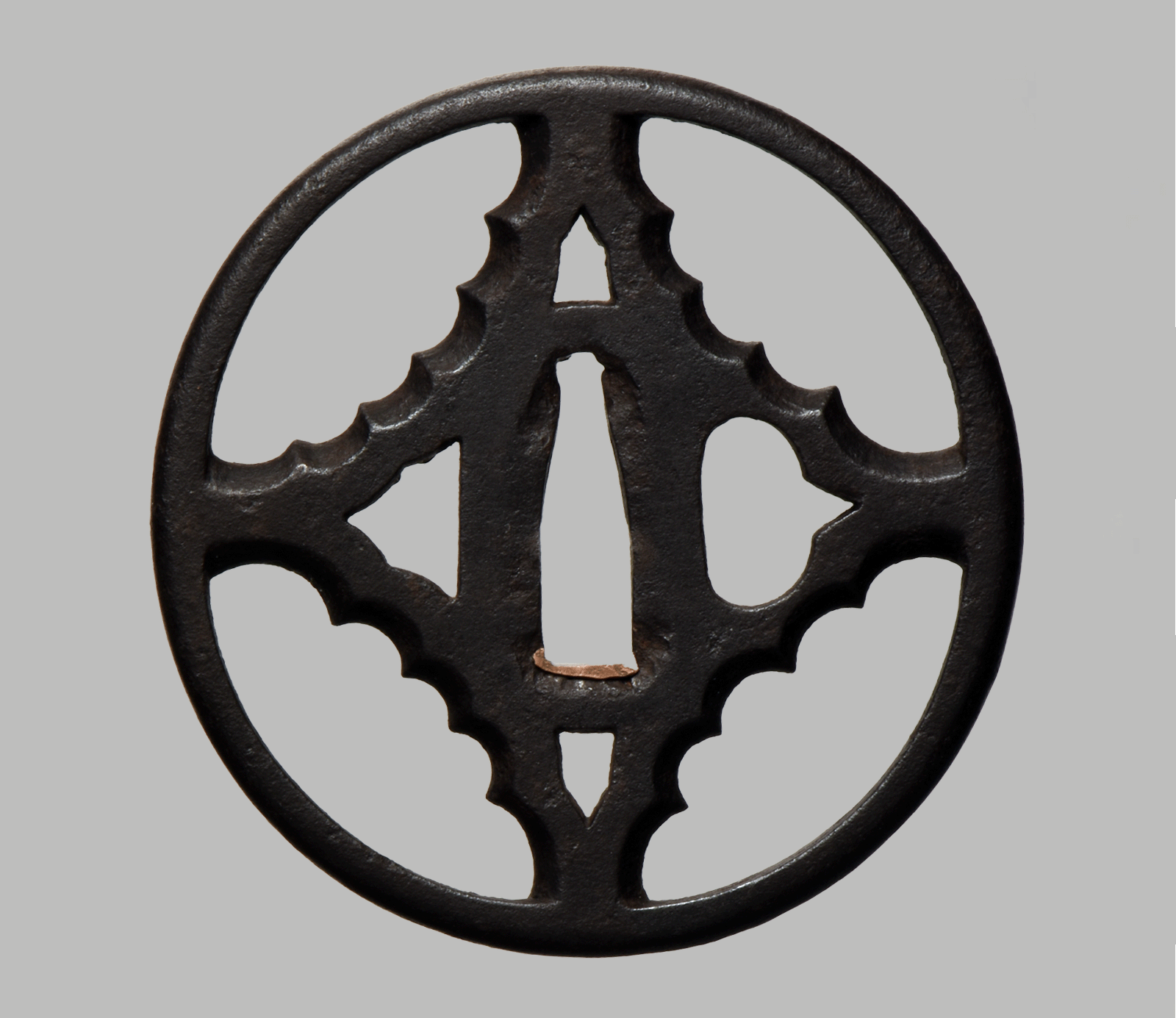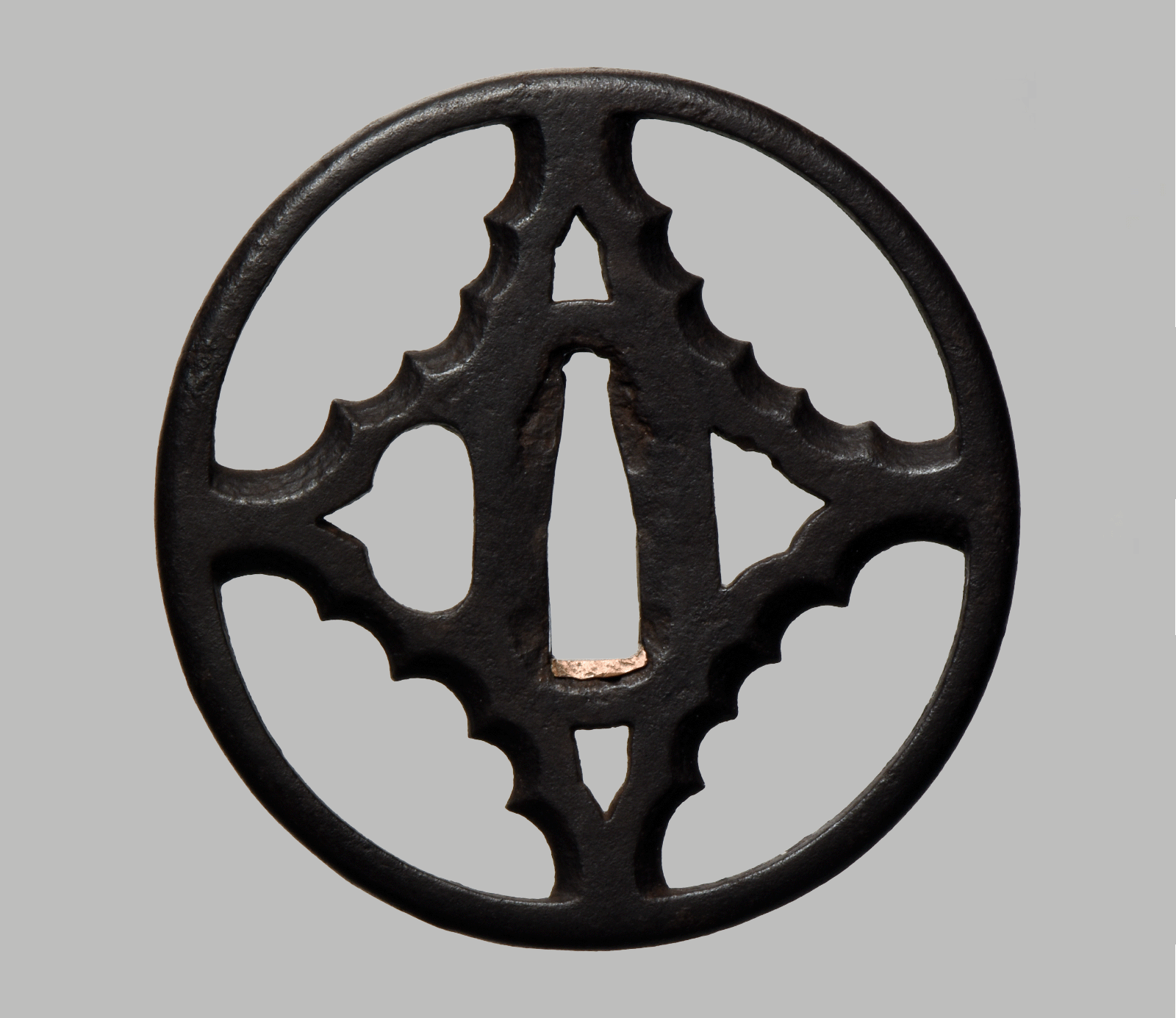 This impressive iron tsuba, attributed to the third master of the Akasaka school and accompanied by NBTHK Hozon authentication as Akasaka work, displays all the hallmarks of the school’s bold and powerful aesthetic. The openwork (sukashi) design depicts a stylized spindle motif, possibly alluding to the Japanese folktale of the young girl transformed into a spindle—a subtle narrative element rendered with strength rather than delicacy.