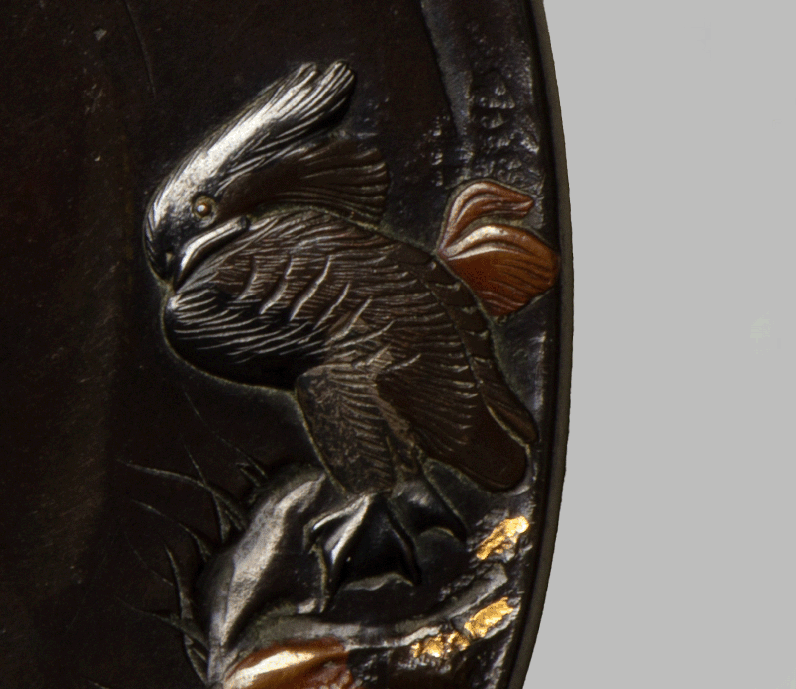 made of soft metal Shibuichi (one quarter silver), round shape, fantastic shakud, Copper, Gold and Yamagane inlay.