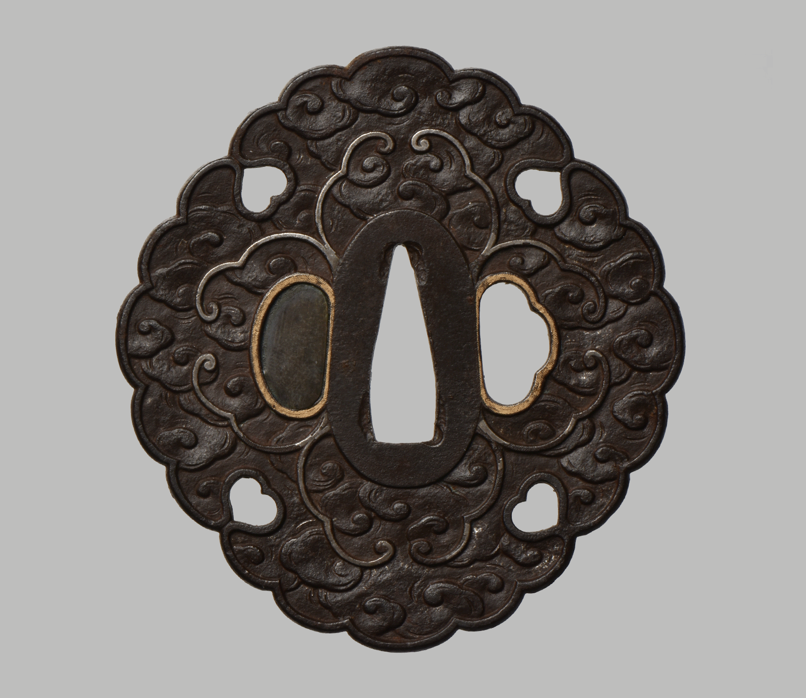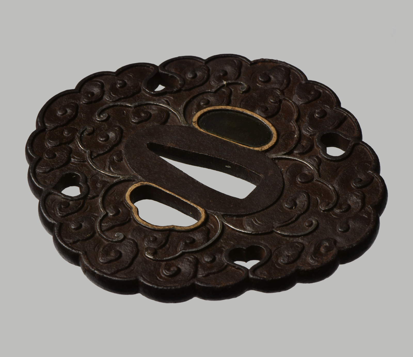 This tsuba, attributed to the Futakoyama School (二子山派), presents a richly carved kumo-mon (雲文, cloud motif) arranged in deeply swirling relief across an oval plate. The entire surface is dominated by dynamic, curling cloud forms rendered with soft modeling and a sense of atmospheric movement, characteristic of the school’s decorative vocabulary. The rim follows an undulating outline shaped by the rhythm of the cloud layers, giving the tsuba a sculptural silhouette rather than a simple circular profile. The hitsu-ana are framed with traces of nunome-zōgan (布目象嵌, textile-pattern inlay) in gold, a refinement that contrasts against the dark, well-forged iron base. The plate shows controlled hammer work and subtle texturing, typical of mid-Edo craftsmanship, executed with the Futakoyama School’s tendency toward elegance and restrained ornamentation.
