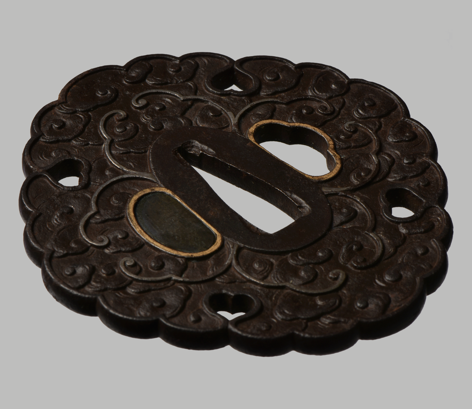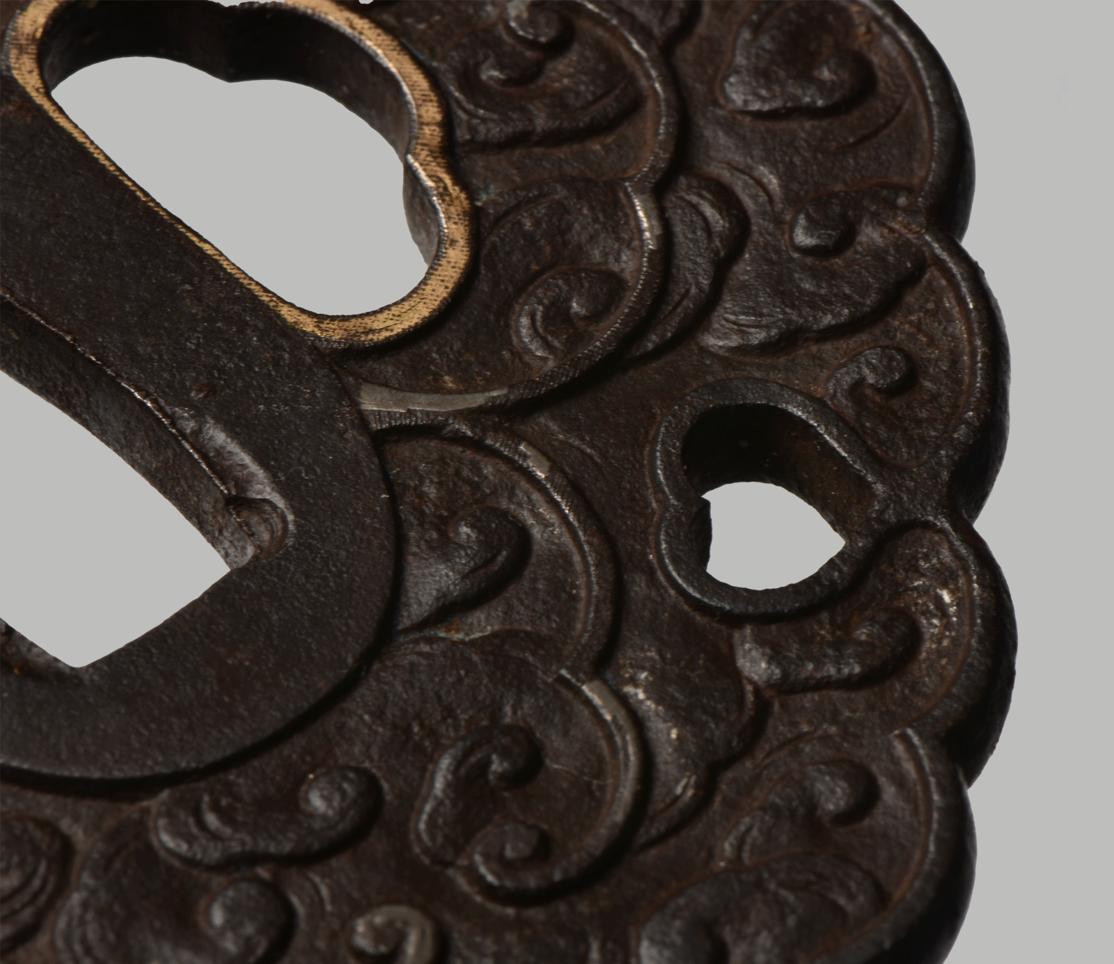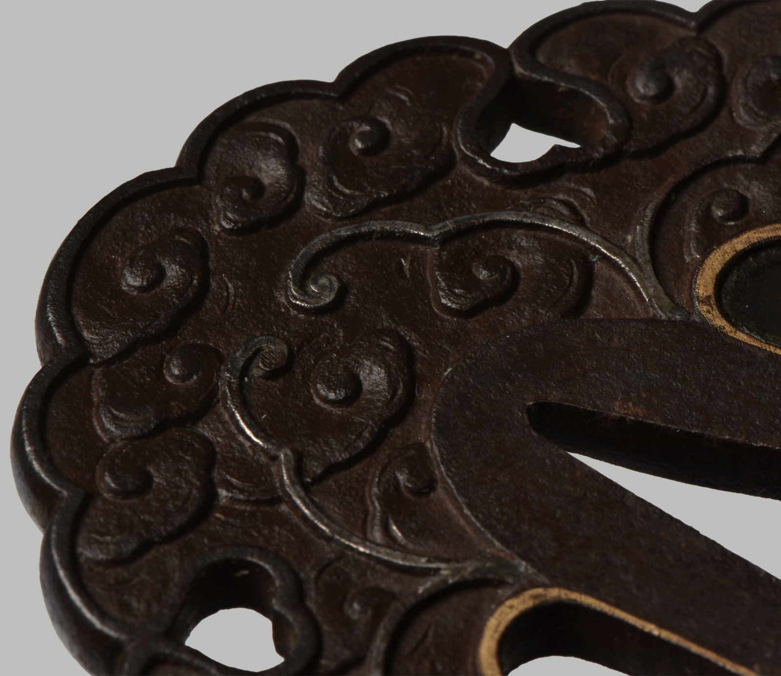 Interpreting this design, the cloud motif carries profound symbolic weight in Japanese aesthetics. Clouds evoke transformation, the unseen movement of the heavens, and the ever-shifting boundary between the earthly world and the divine. In samurai culture, such imagery could reflect ideals of mujō (無常, impermanence) and readiness for change, or the aspiration toward elevated clarity of mind. Clouds also appear in classical literature and Noh iconography, suggesting a cultivated warrior with an affinity for poetic and cosmological themes. The careful flow of the swirling forms on this tsuba likely appealed to a samurai who appreciated refined symbolism rather than overt martial imagery.