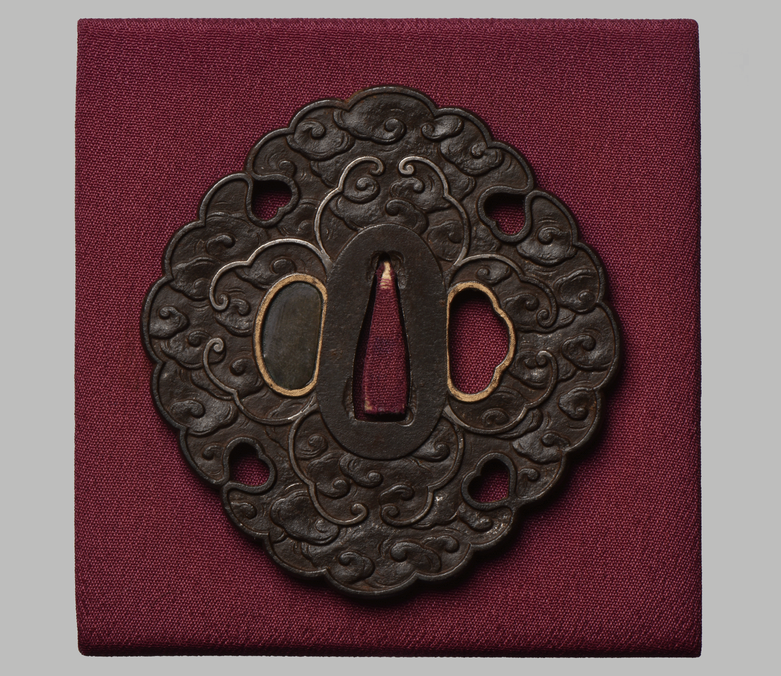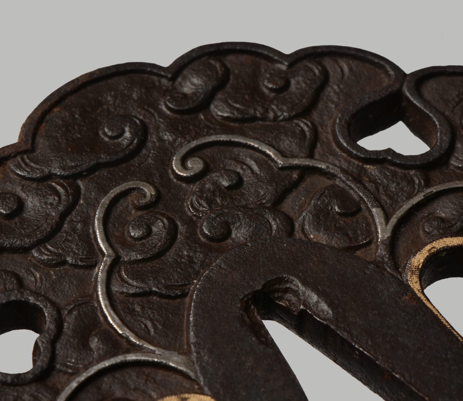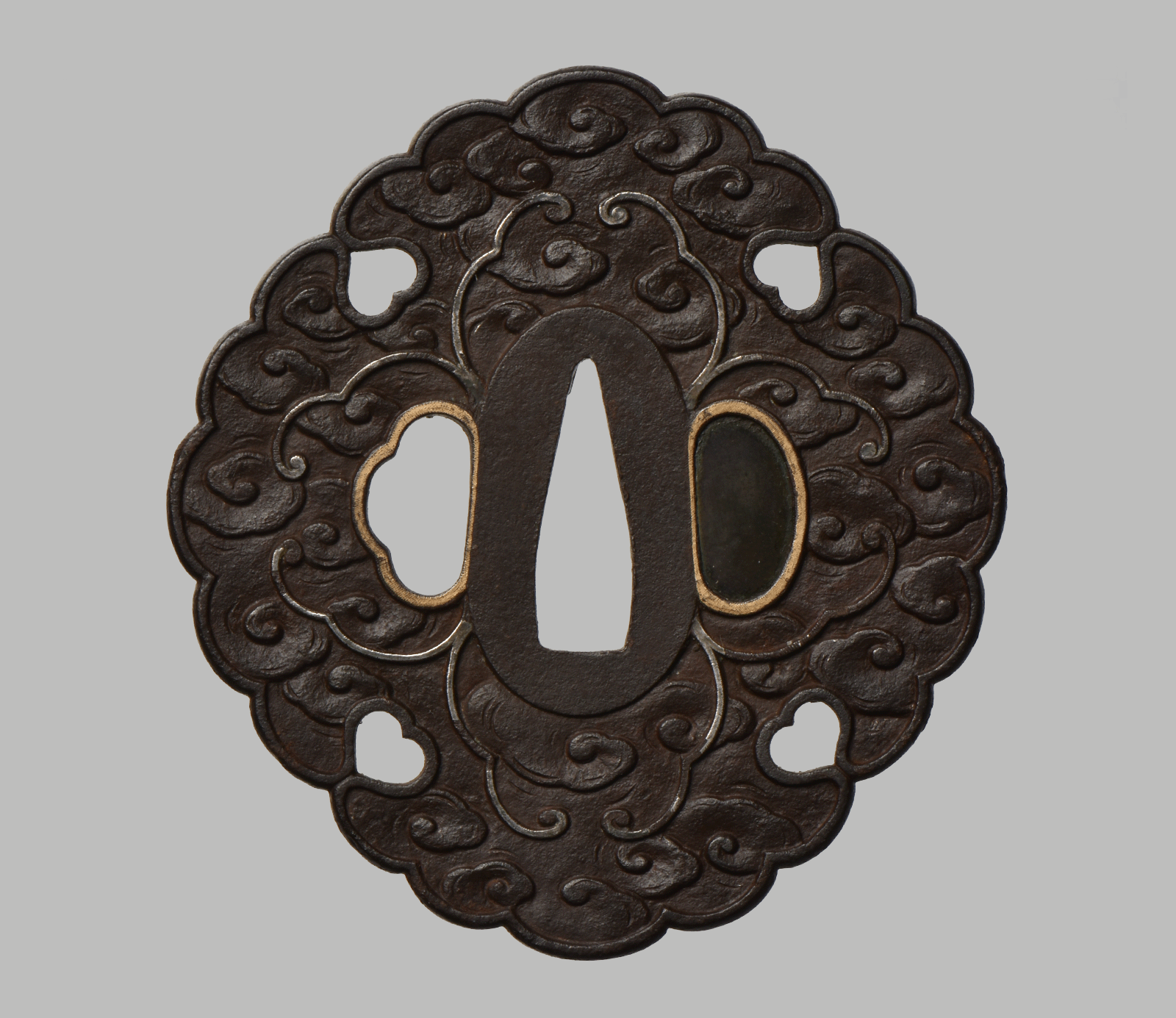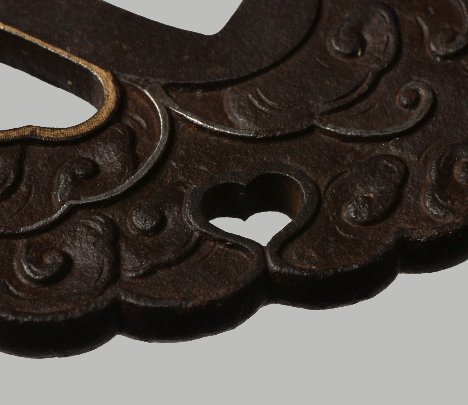Interpreting this design, the cloud motif carries profound symbolic weight in Japanese aesthetics. Clouds evoke transformation, the unseen movement of the heavens, and the ever-shifting boundary between the earthly world and the divine. In samurai culture, such imagery could reflect ideals of mujō (無常, impermanence) and readiness for change, or the aspiration toward elevated clarity of mind. Clouds also appear in classical literature and Noh iconography, suggesting a cultivated warrior with an affinity for poetic and cosmological themes. The careful flow of the swirling forms on this tsuba likely appealed to a samurai who appreciated refined symbolism rather than overt martial imagery.