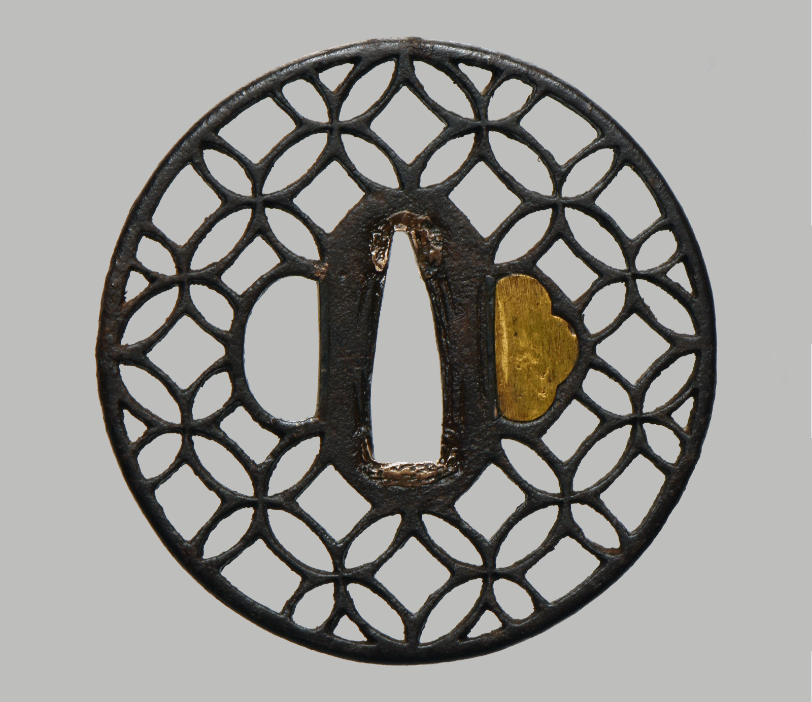 To its right is a small inlaid detail made from a lighter metal—likely copper alloy—serving either as a decorative accent. On the left side is an oval kōgai-ana. The tsuba fits well within the proportions expected of a delicate yet sturdy sukashi guard from the Edo period. Its surface shows a dark, patina with sgins of wear on raised areas and rusted spots, typical after encrustatons from blood, It has indeed been used in fitghts, adding to its sense of age and authenticity. Overall, it represents an elegant synthesis of geometric design and technical finesse, characteristic of Kyō-sukashi work from the 17th to 18th century.