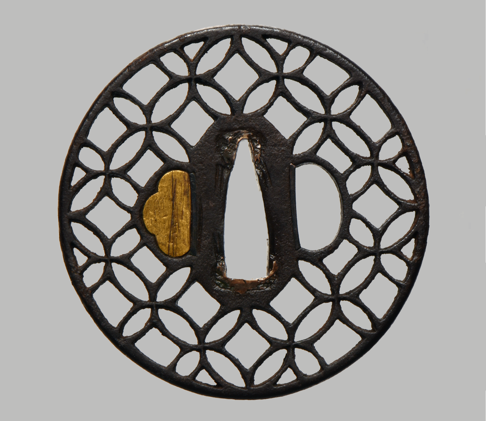 This tsuba is a round iron guard executed in the Kyō-sukashi style, featuring a finely crafted shippō-mon pattern composed of overlapping circles symbolizing harmony, good fortune, and the continuity of life.