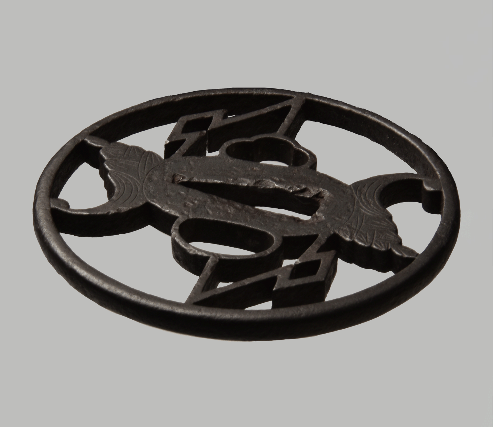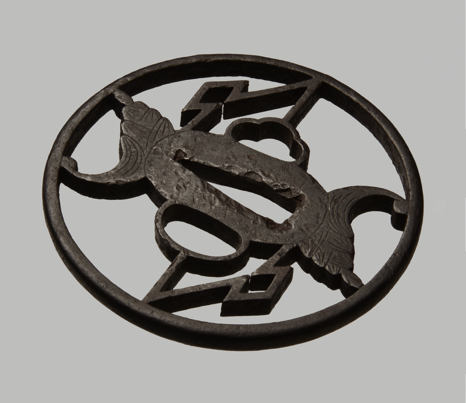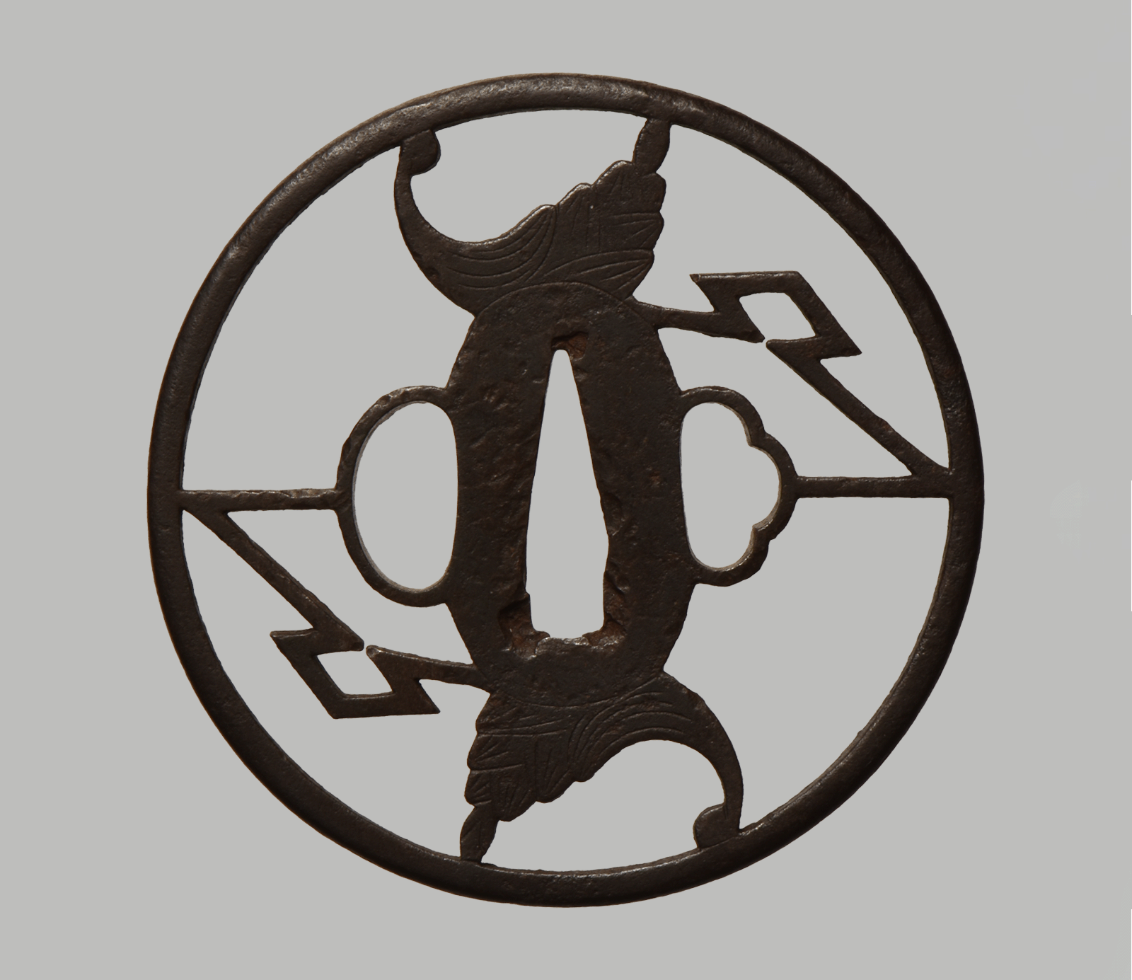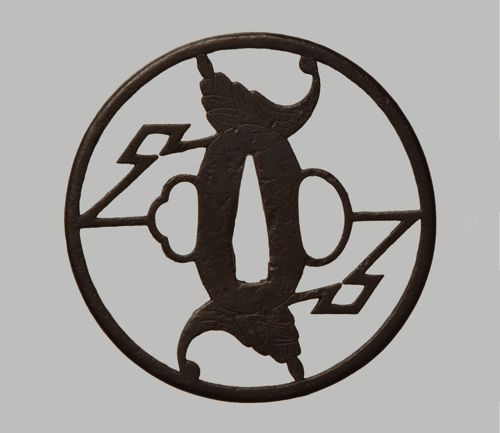 To either side of the central composition appear angular openwork elements interpreted as an abstracted form of the Matsudaira crest (Matsudaira-mon), alluding to the authority and legitimacy of the Matsudaira/Tokugawa family. The pairing of these elements suggests a symbolic interplay between spiritual and worldly protection, reflecting concerns meaningful to samurai of the period.